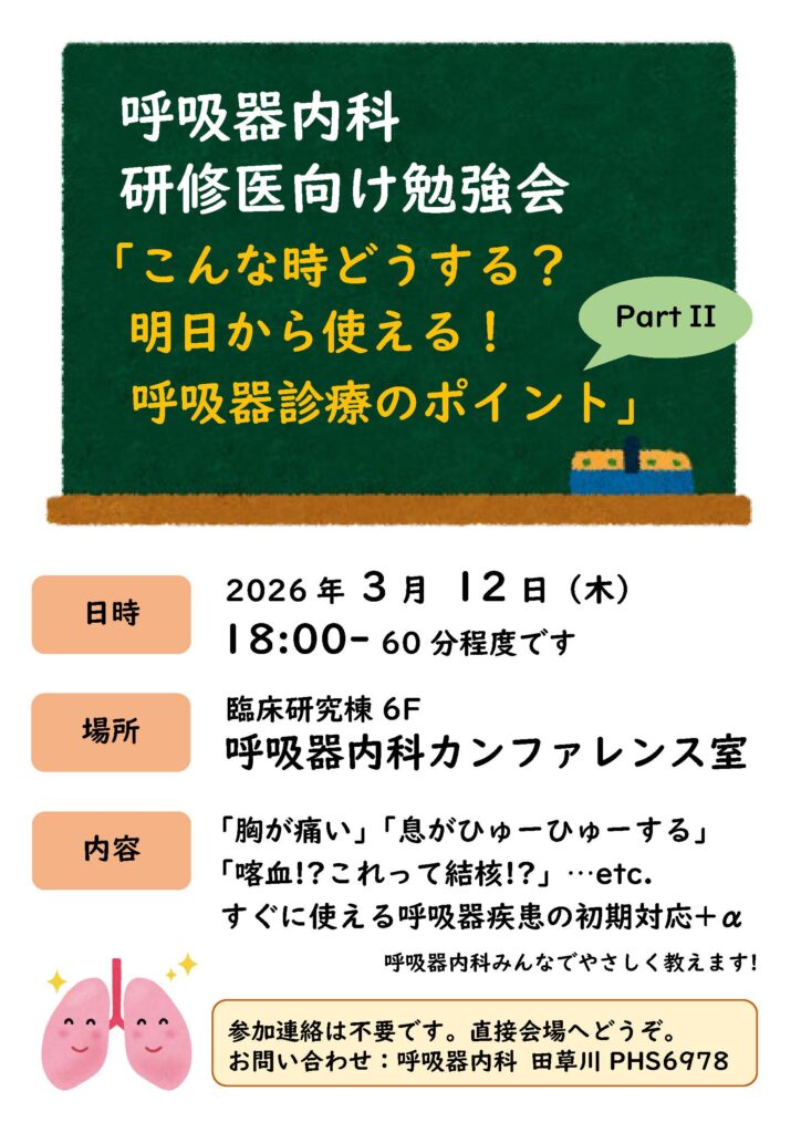3月12日(木) 研修医勉強会 「こんな時どうする?明日から使える!呼吸器診療のポイントpart II」 を開催します。